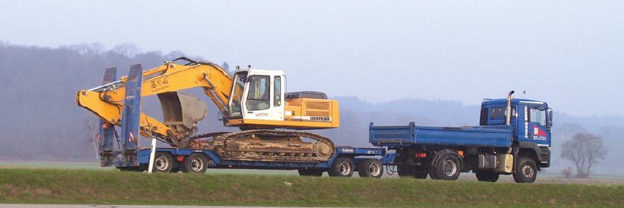 Wir beschäftigen ausschließlich geschulte und motivierte Fahrer, die permanent Schüttgüter, Maschinen, Fertigteile und Abbruchmaterial transportieren. Ausnahmegenehmigungen für Überbreite, Übergewicht und Überlänge sind bei uns als Dauergenehmigung vorhanden.